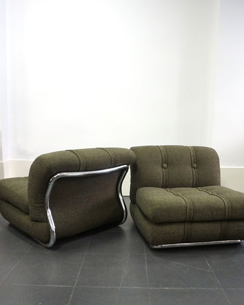 Pareja de sillones modulares italianos diseño de los años 70. Estructura de acero cromado tubular que envuelve y sostiene los cojines. Han sido retapizados rehaciéndose los cojines tanto por dentro como por fuera respetando la forma y confección original utilizado un tejido en tweed verde. Son robustos y estables en la línea de los diseñados por Sabot o Piazzesi, muy decorativos y con mucha personalidad. El acero se ha limpiado y pulido y cómo es lógico el paso del tiempo y uso ha dejado alguna marca que no impide que sigan siendo unas piezas muy bonitas. Además, es que cosas nuevas no vendo, ahí está la exclusividad y el encanto.