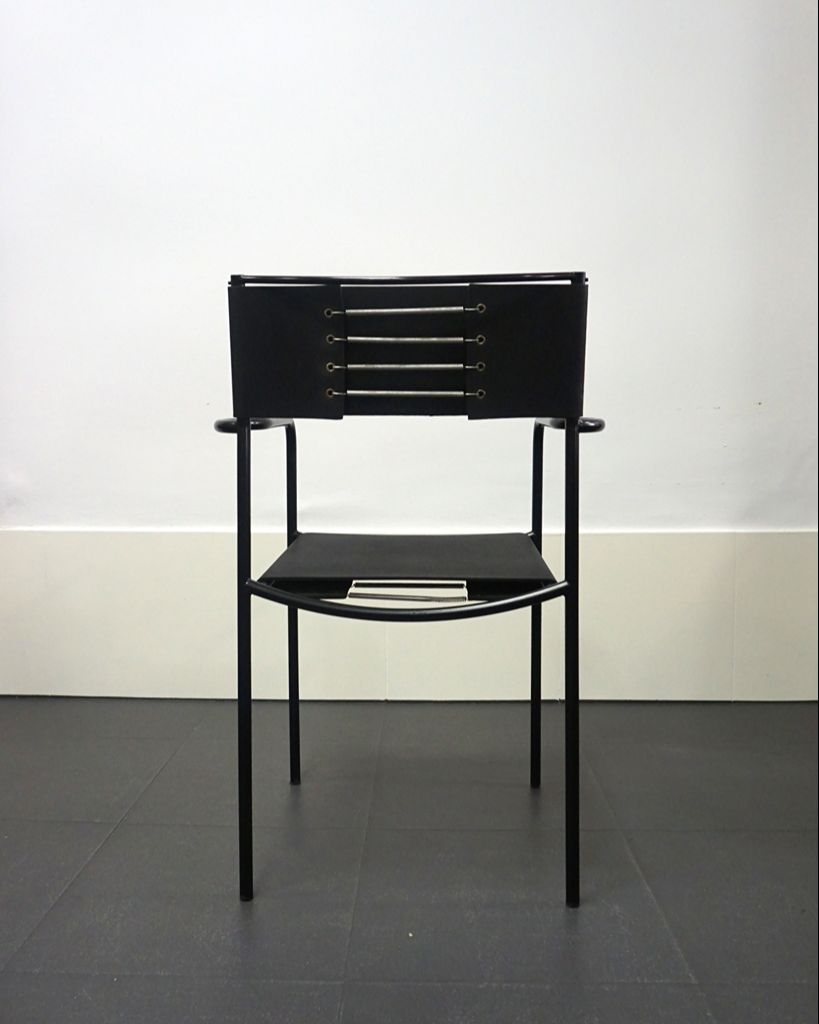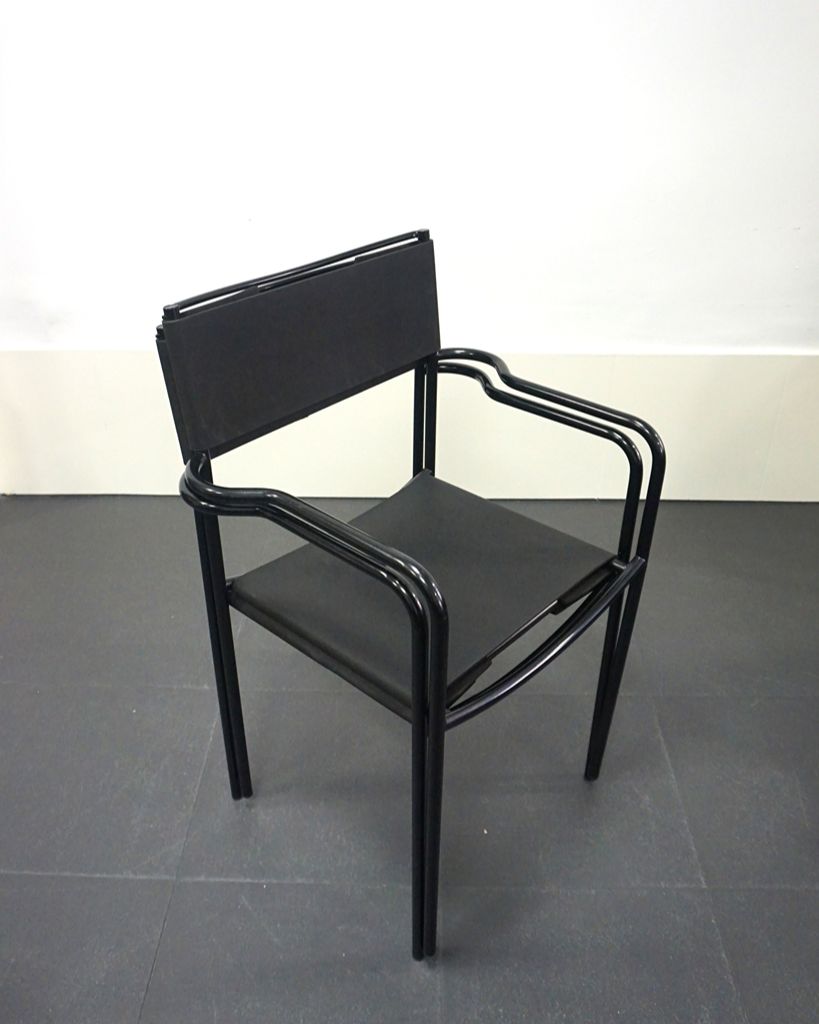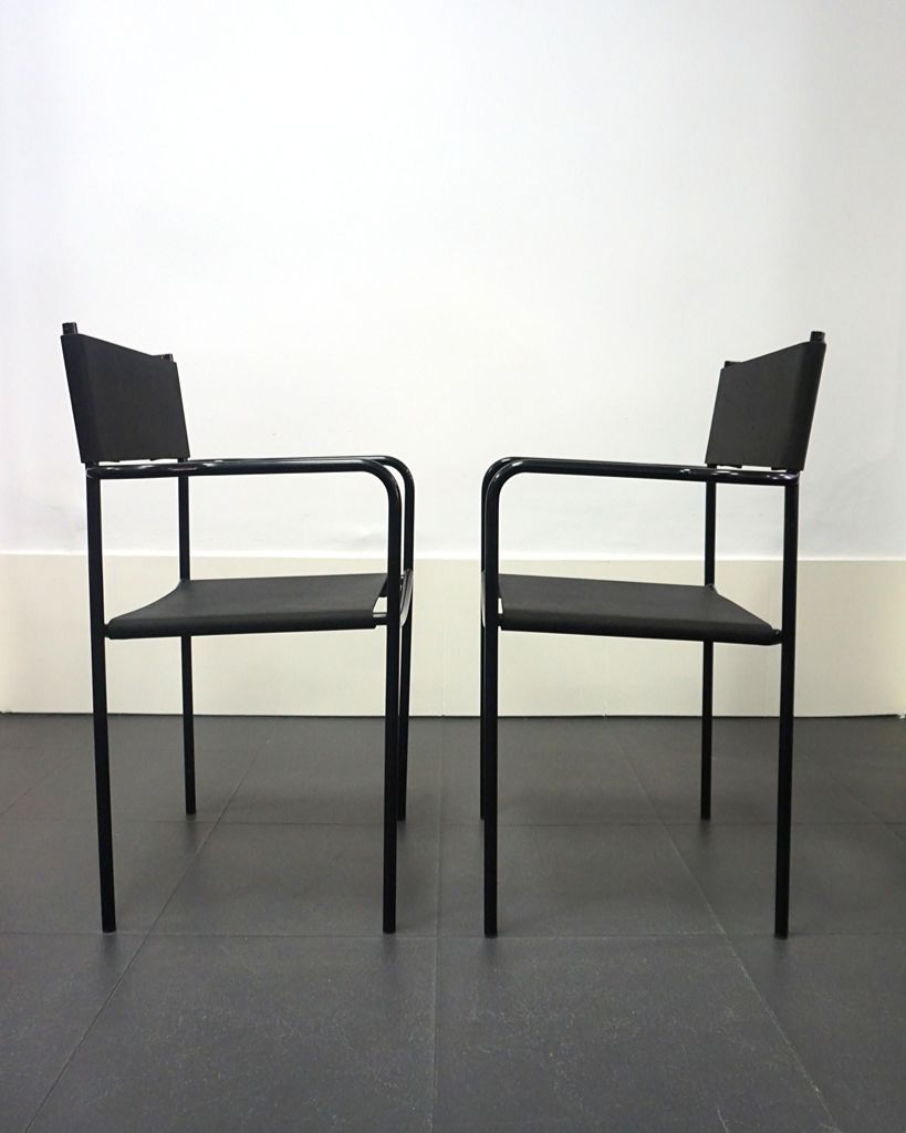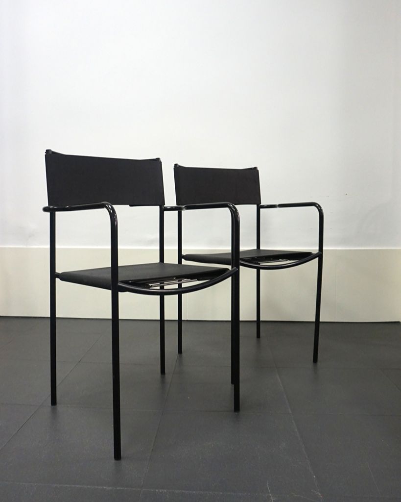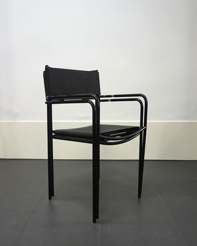 Giandomenico Belotti diseña la Spaghetti Chair en 1979 para la firma italiana Alias, convirténdose en una silla icónica dentro del diseño moderno italiano presente en colecciones como la del MoMA de Nueva York o el Museo Triennale de Milán. Entre las diferentes modelos que diseña Belotti se encuentra esta variante con brazos y apilable. Estas sillas además son una versión menos común pero muy interesante ya que el asiento y respaldo son en neopreno negro. Se trata de sillas elegantes, estables , resistentes y se encuentran en muy buen estado de conservación con algun signo de uso y paso del tiempo.