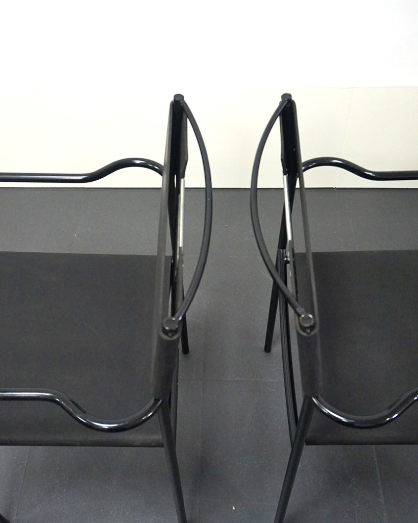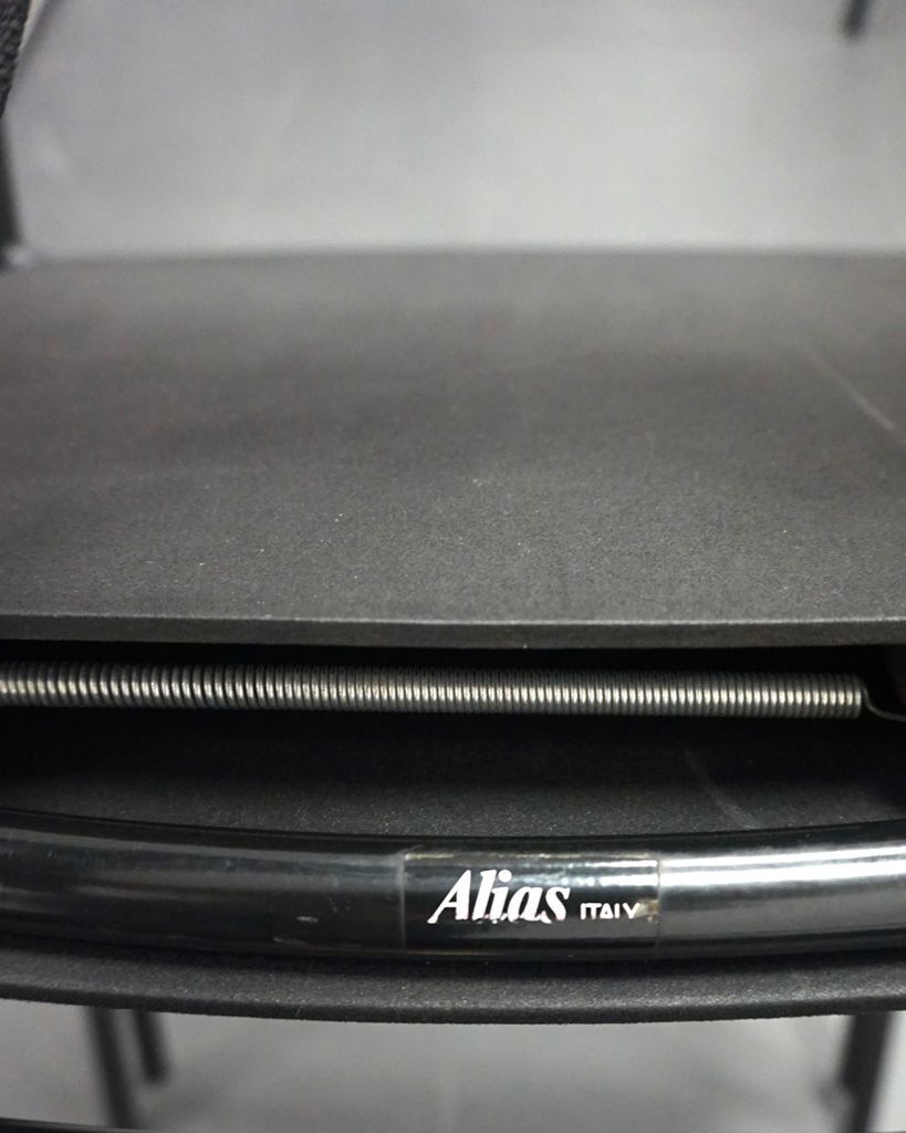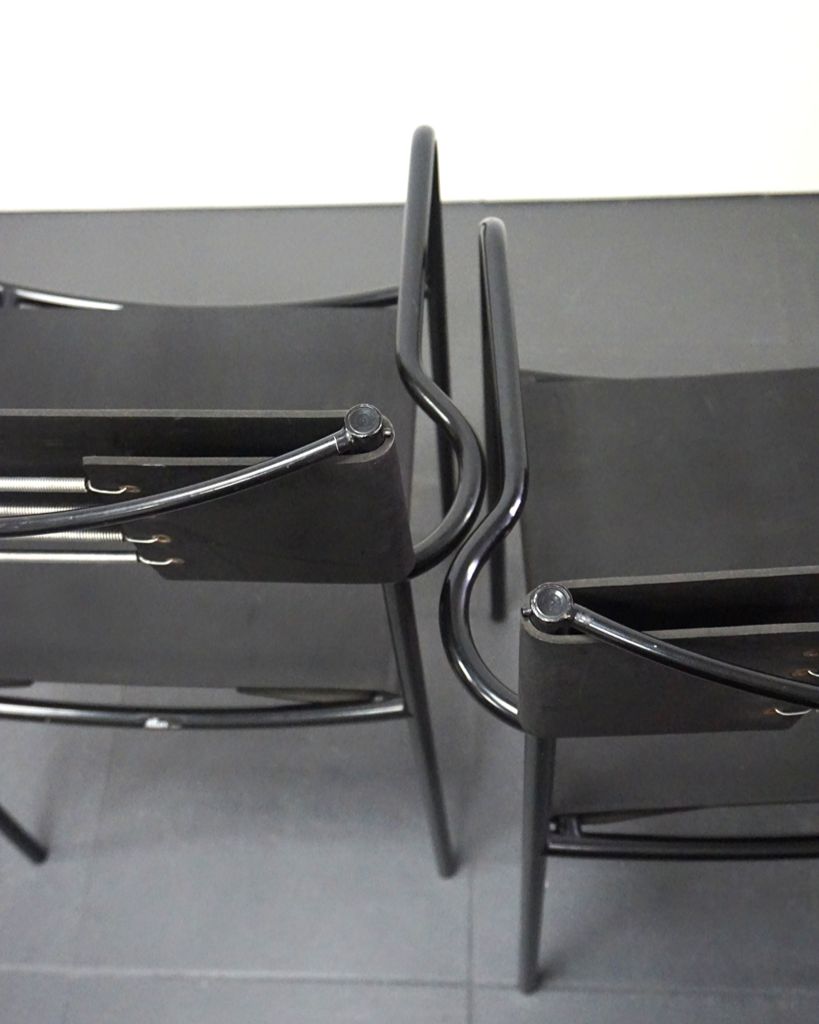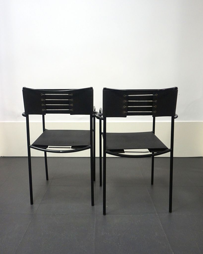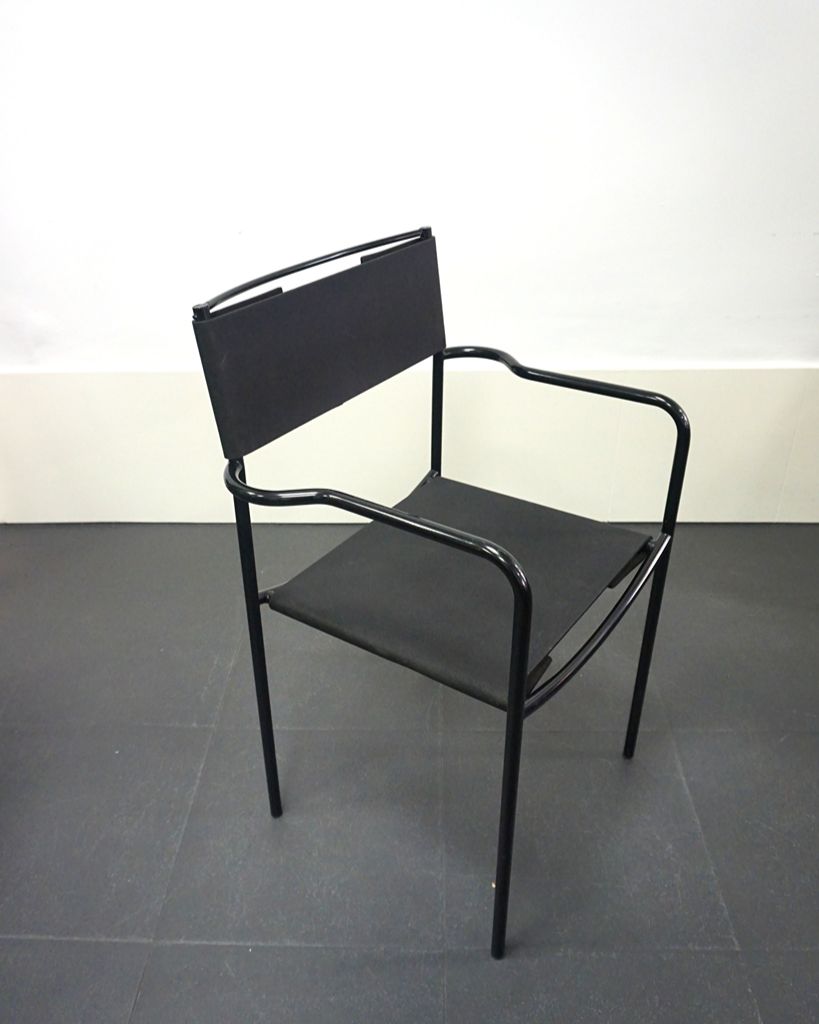 Giandomenico Belotti diseña la Spaghetti Chair en 1979 para la firma italiana Alias, convirténdose en una silla icónica dentro del diseño moderno italiano presente en colecciones como la del MoMA de Nueva York o el Museo Triennale de Milán. Entre las diferentes modelos que diseña Belotti se encuentra esta variante con brazos y apilable. Estas sillas además son una versión menos común pero muy interesante ya que el asiento y respaldo son en neopreno negro. Se trata de sillas elegantes, estables , resistentes y se encuentran en muy buen estado de conservación con algun signo de uso y paso del tiempo.