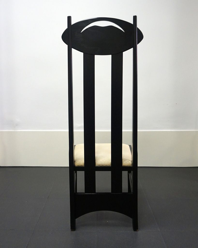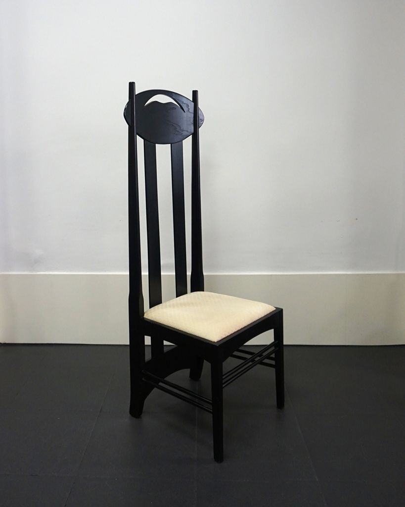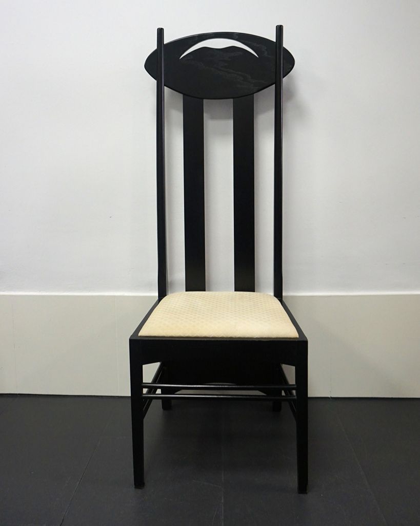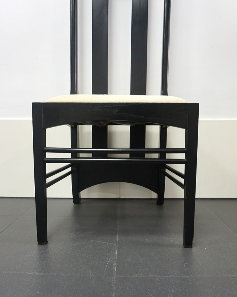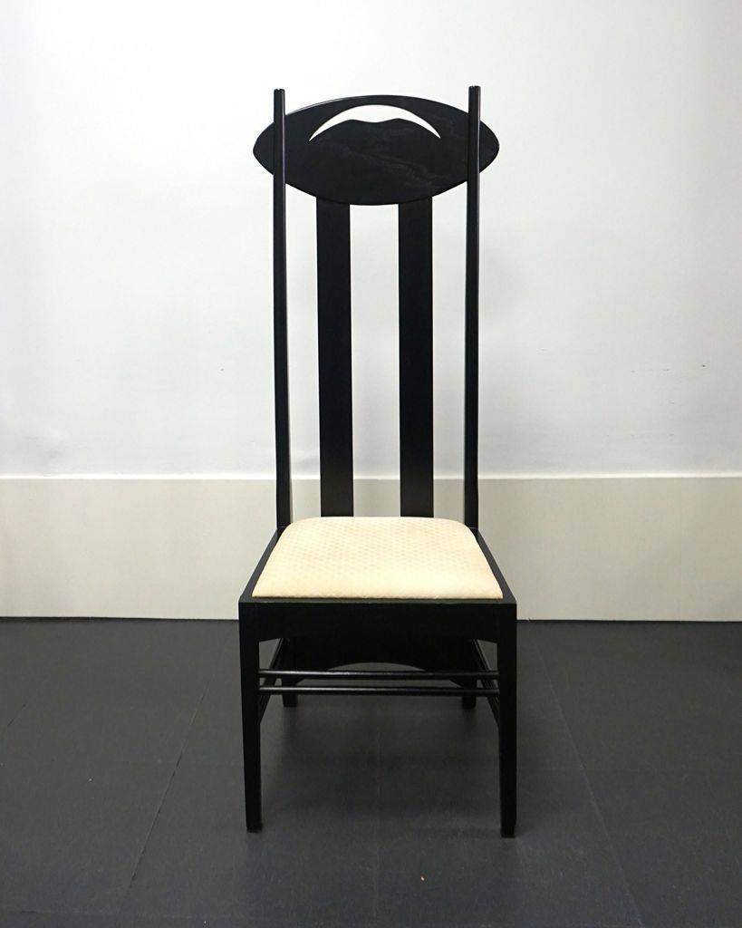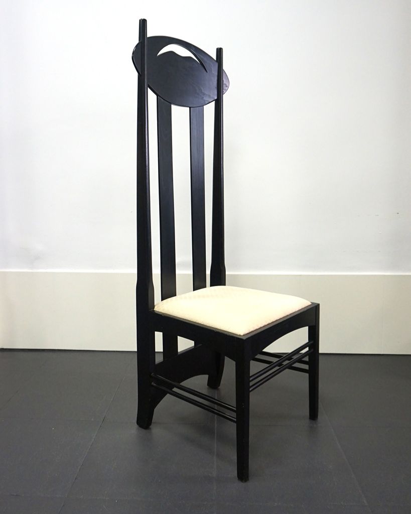 Silla diseñada en 1897 por Charles Rennie Mackintosh para amueblar los interiores de los salones de té de la empresaria y mecenas Catherine Cranston en Argyle Street, Glasgow . Se trata de una de las sillas más emblemáticas del famoso arquitecto y pintor escocés precursor del Movimiento de Glasgow. La silla es reconocible por su respaldo alargado con un remate ovalado que contiene un recorte que parece un «pájaro en vuelo». Esta silla Argyle es una reedición italiana de los años 70 en madera de fresno lacada en negro. Se encuentra estable y en muy buen estado de conservación con algunos signos leves de uso y paso del tiempo. Tapicería original con algún signo de desgaste.