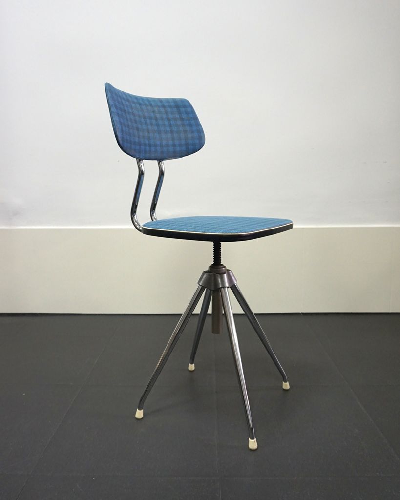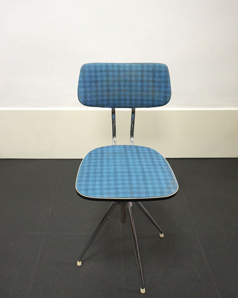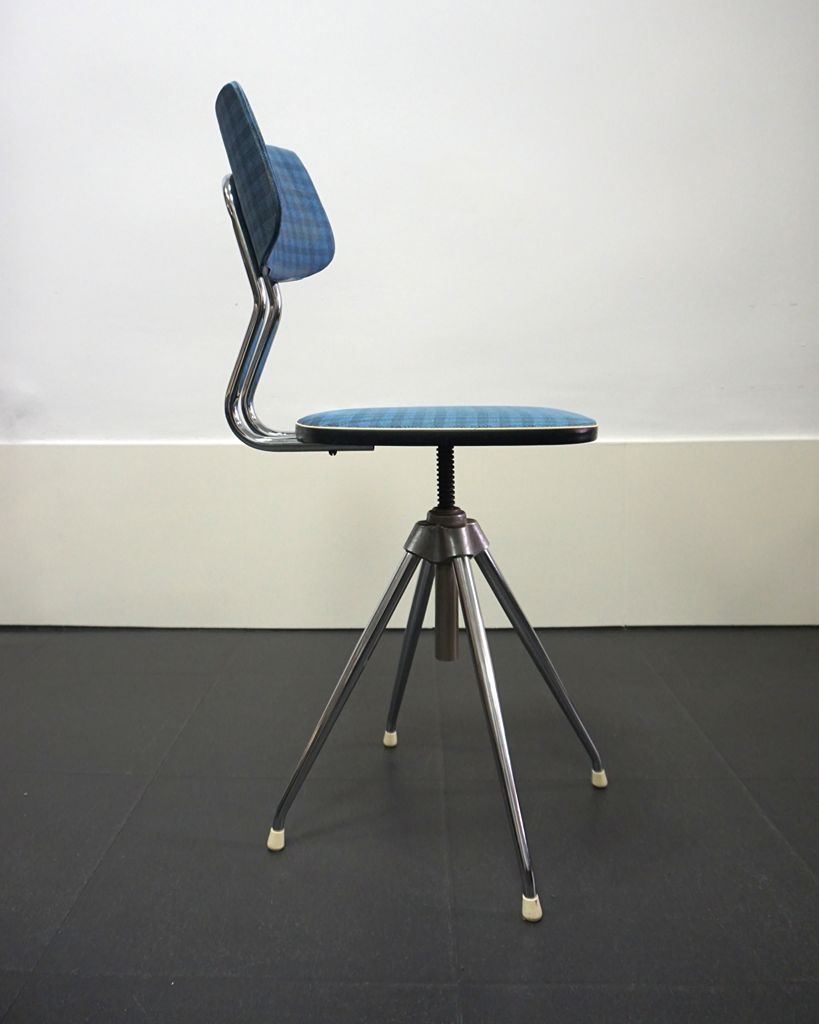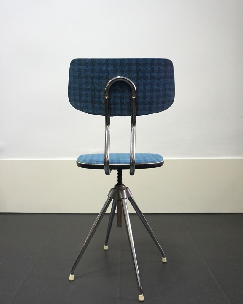 Silla de oficina alemana de los años 60. Estructura de acero que descansa sobre cuatro patas, tiene ajuste de altura y es giratoria. Diseño retro con tapicería original en una especie de hule de cuadros azules. La silla se encuentra estable y el cromado en muy buen estado. En la unión de la parte baja del respaldo la tapicería se ha abierto un poco.