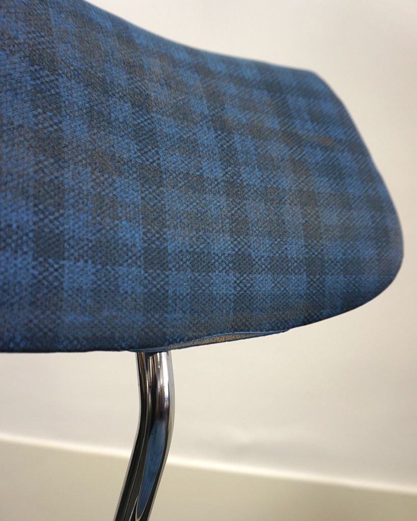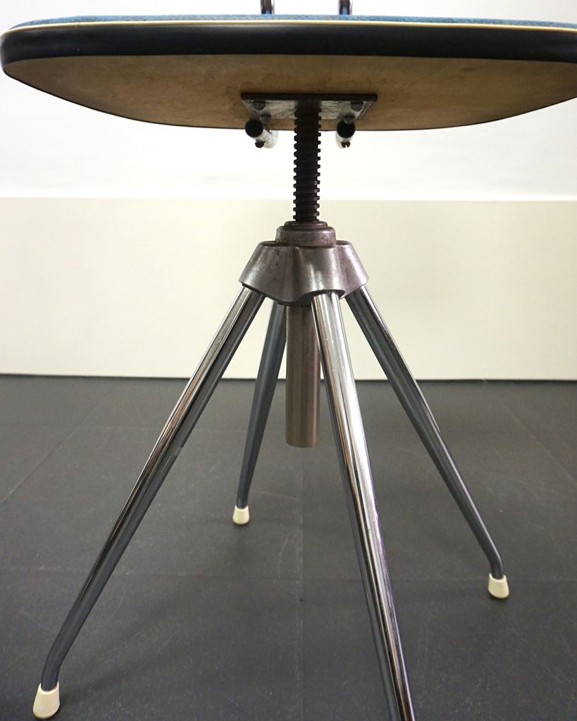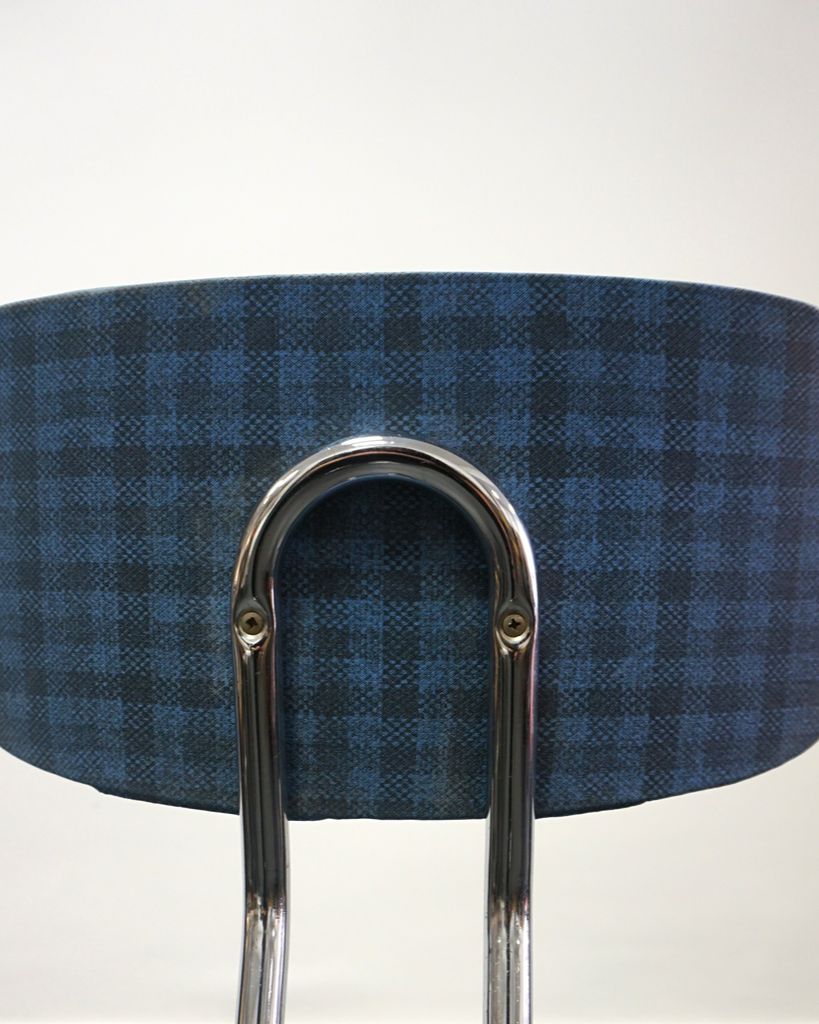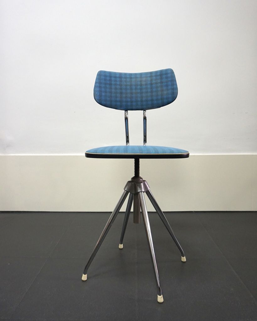 Silla de oficina alemana de los años 60. Estructura de acero que descansa sobre cuatro patas, tiene ajuste de altura y es giratoria. Diseño retro con tapicería original en una especie de hule de cuadros azules. La silla se encuentra estable y el cromado en muy buen estado. En la unión de la parte baja del respaldo la tapicería se ha abierto un poco.