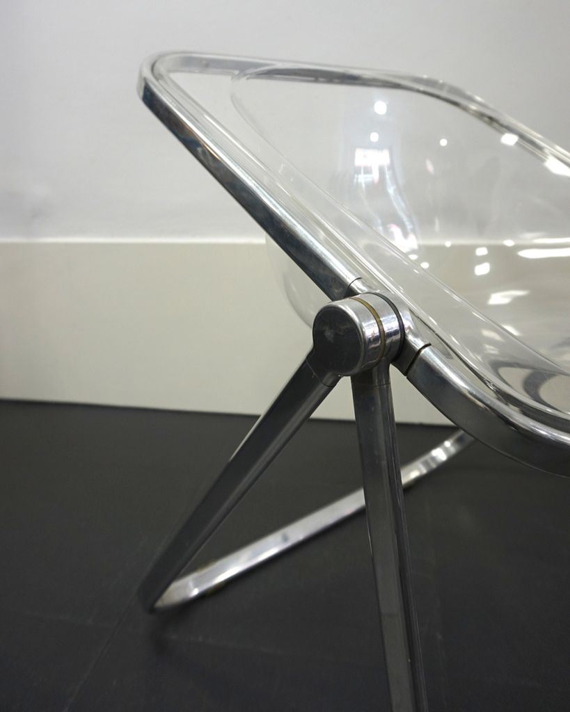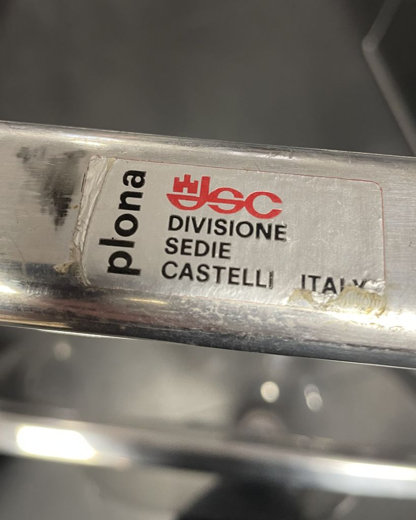 Silla modelo Plona diseñada por Giancarlo Piretti en 1970 y producida por Castelli. Se trata de una pieza icónica del diseño italiano, su estructura de aluminio pulido y asiento de plexiglás transparente le dotan de una estética ligera, futurista y atemporal. Gracias a su trabajo con Castelli, Giancarlo Piretti ganó numerosos premios, incluyendo el Compasso d’Oro en 1971 (por la silla Plia) y posicionó a la marca como una referencia mundial en mobiliario de diseño.