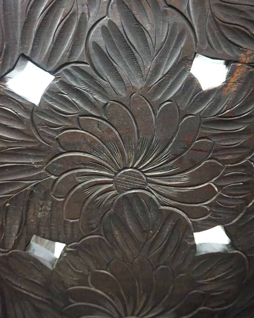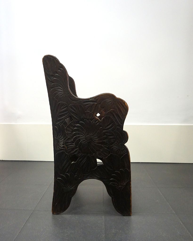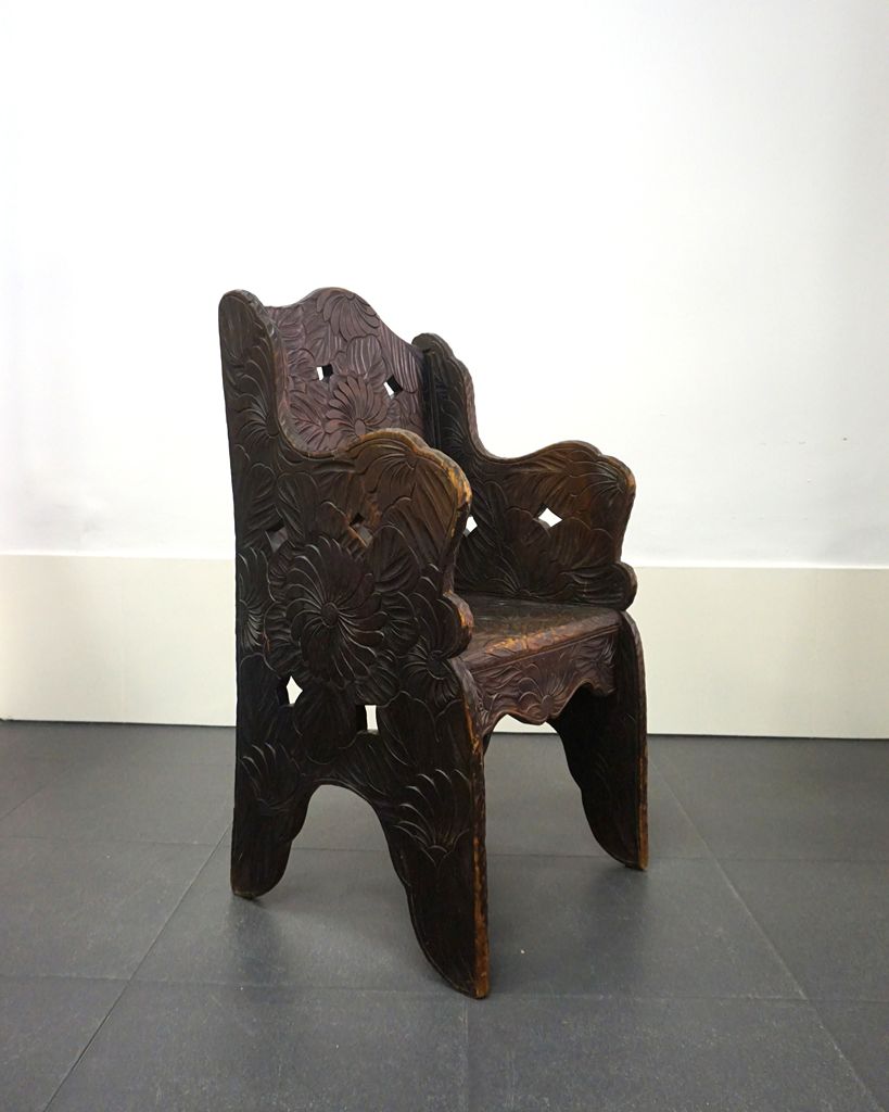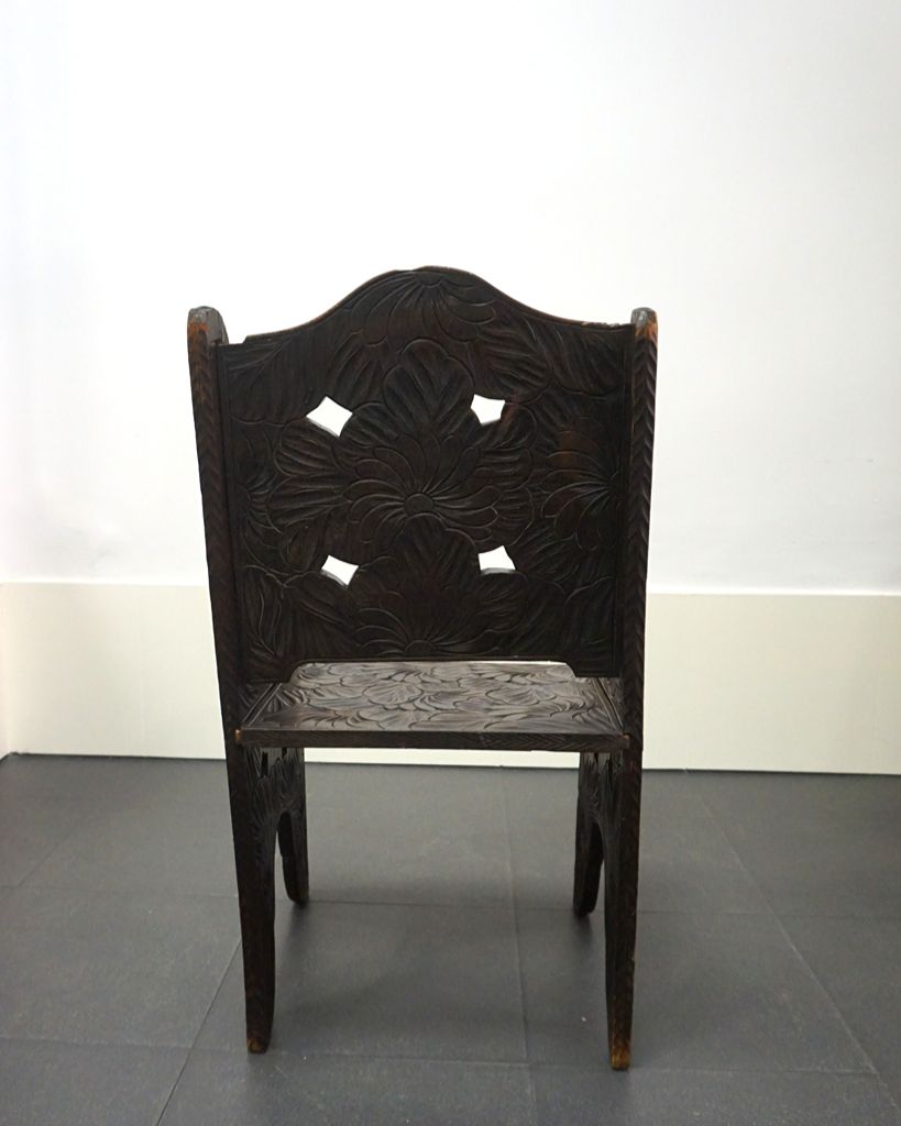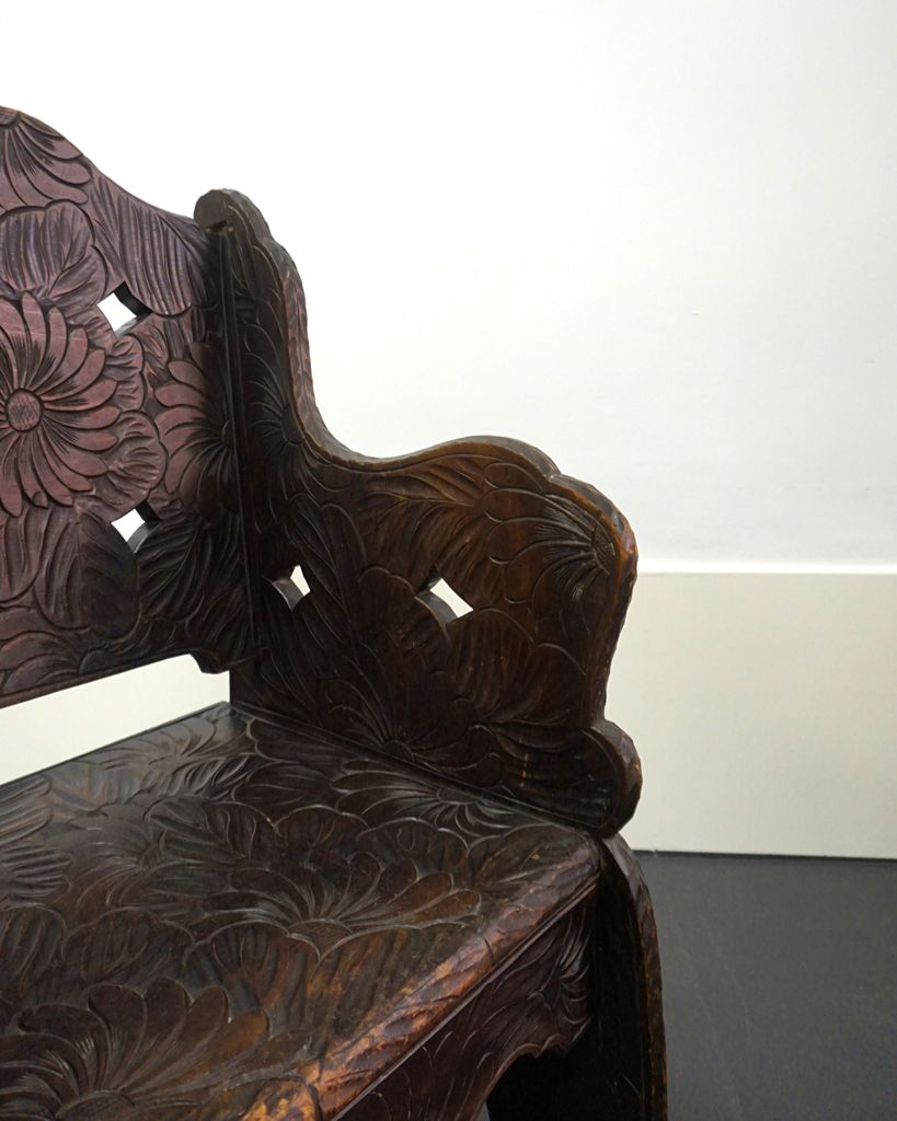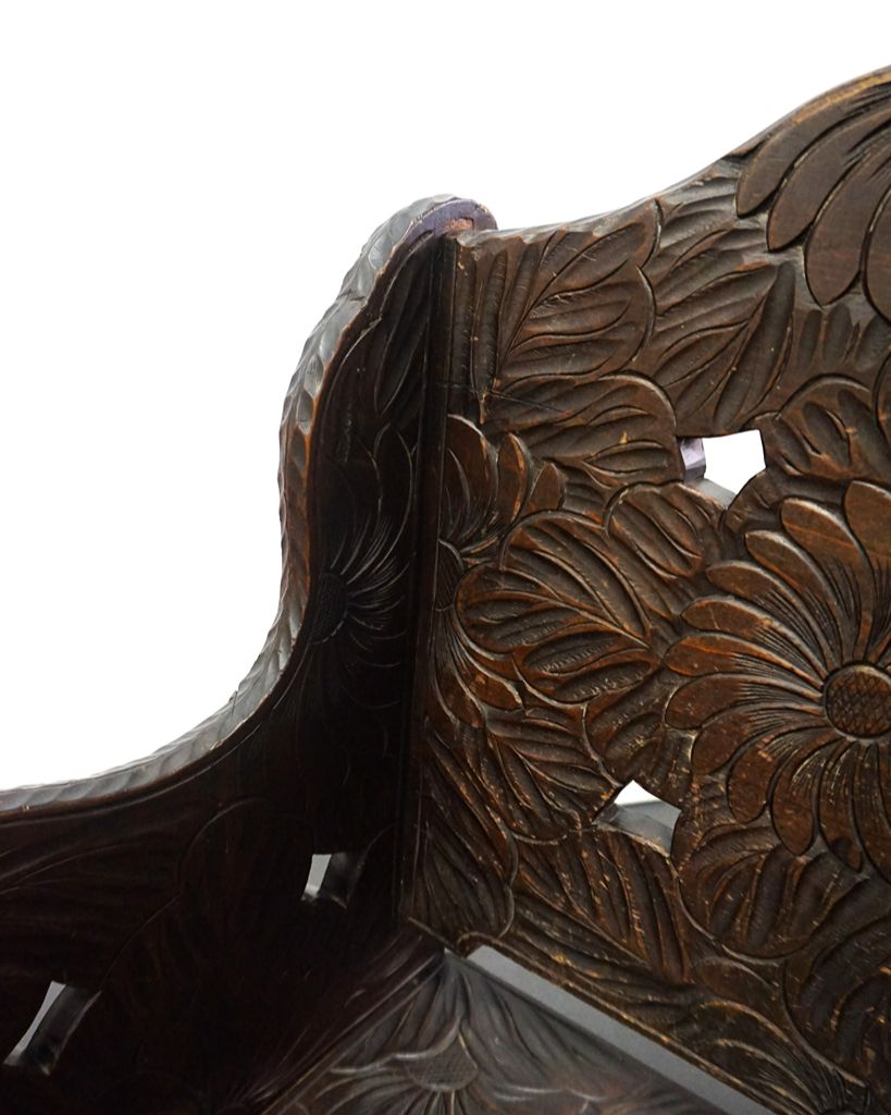 Esta singular y decorativa silla es una pieza que data de principio del siglo XX . Fabricada artesanalmente en Japón para los almacenes Liberty & Co. de Londres, está tallada en su totalidad con motivos de peonias. Estas piezas fueron importadas principalmente entre 1900 y 1910 y son un claro ejemplo del movimiento Arts & Crafts y también del gusto por lo oriental de la época . Una pieza única con historia.