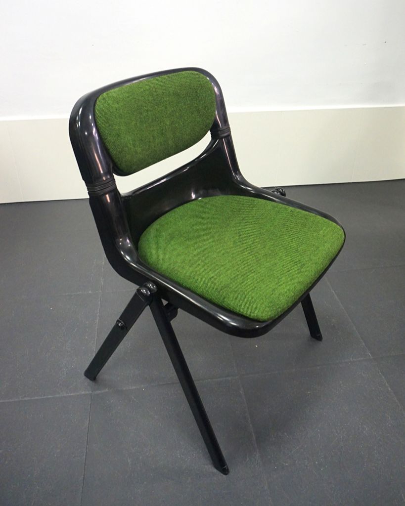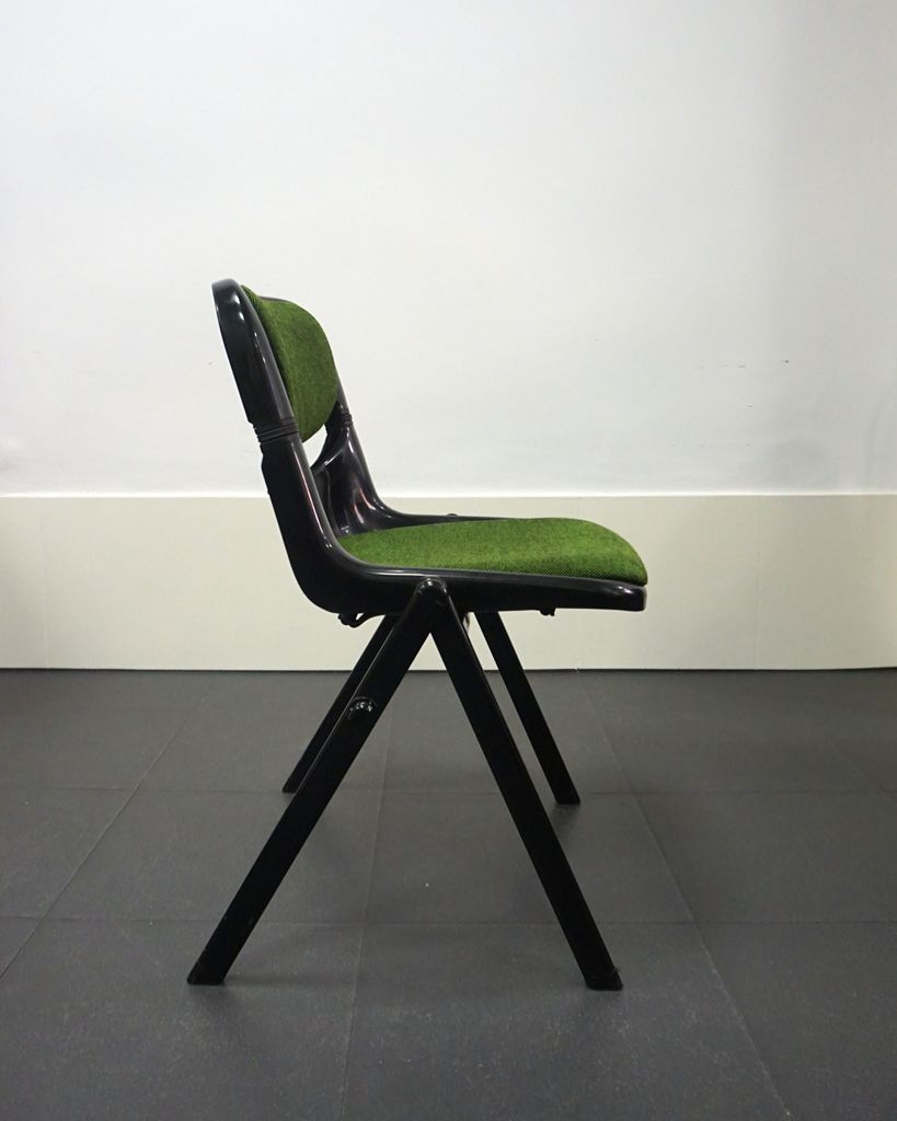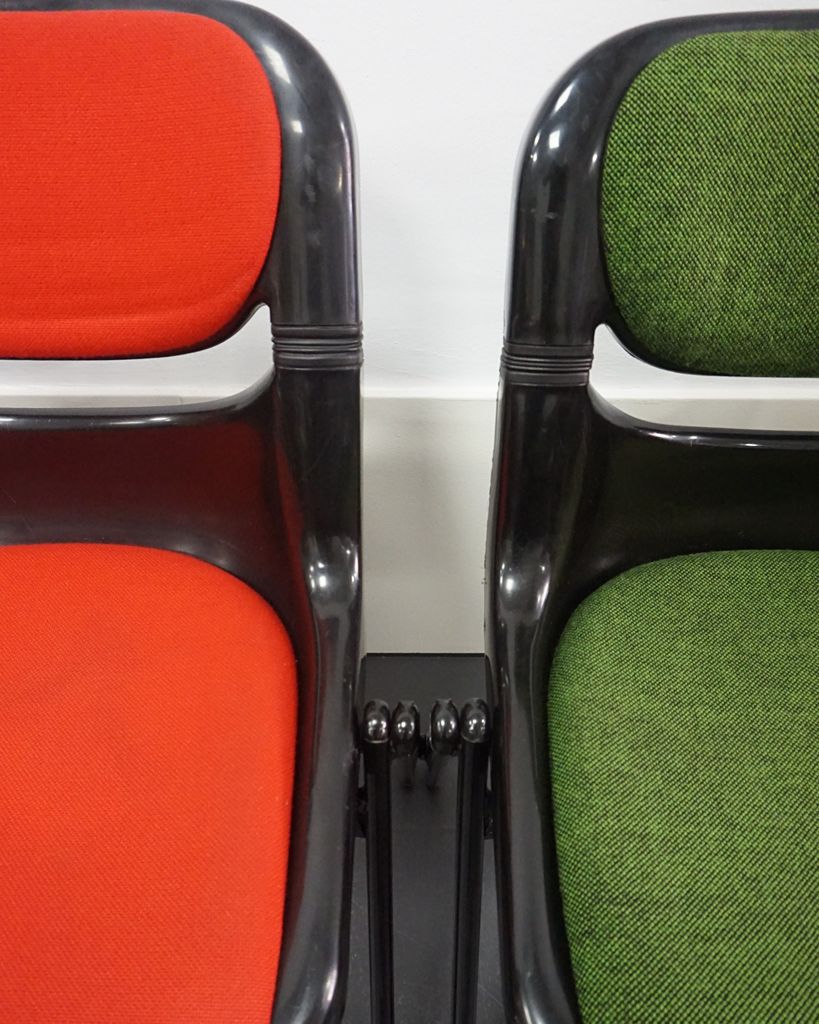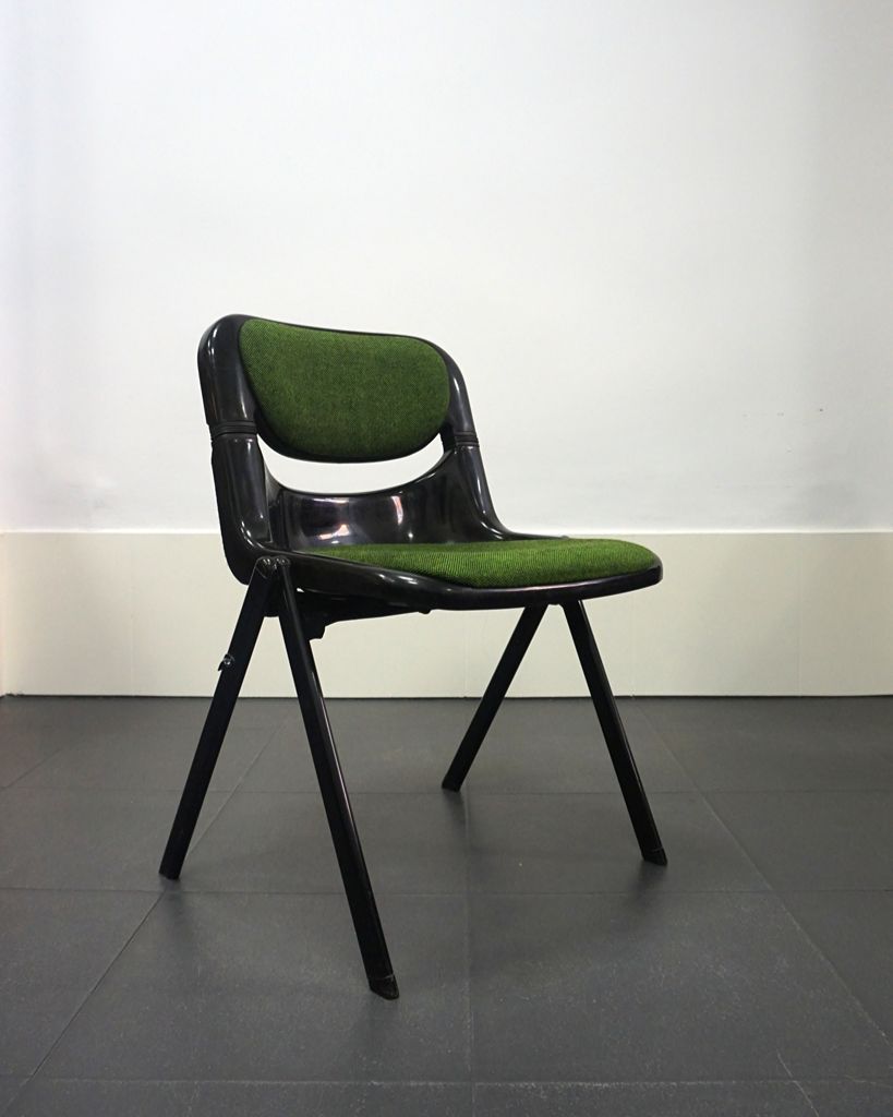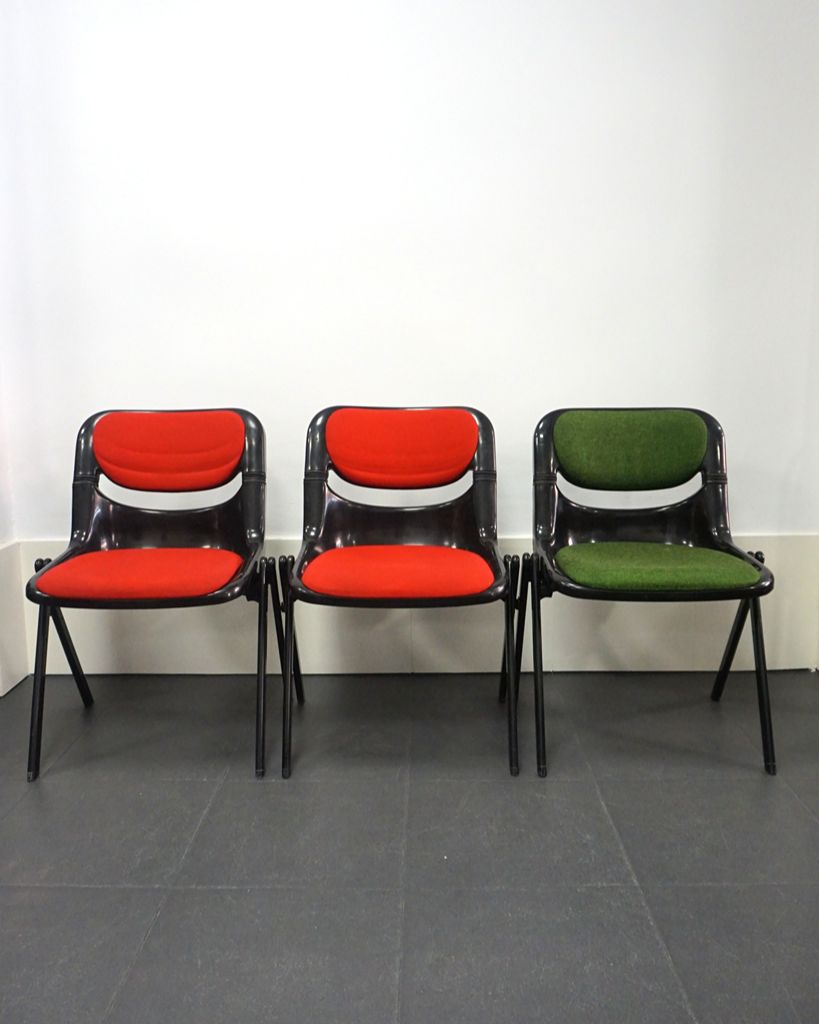 Sillas de oficina modelo » Dorsal» diseñadas en los años 80 por Emilio Ambas y Giancarlo Piretti para la empresa italiana Openark. La característica de esta silla es que el respaldo se ajusta a la espalda permitiendo cierta oscilación. La estructura es de acero y el asiento de plástico inyectado sobre una base metálica. Se pueden unir mediante un enganche lateral formando así un banco y también son apilables. Muy cómodas.